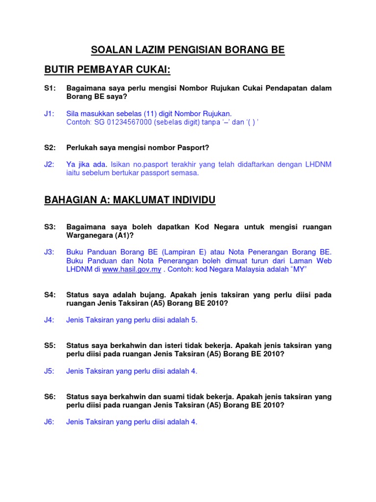 Soalan Lazim Pengisian Borang Be Butir Pembayar Cukai
