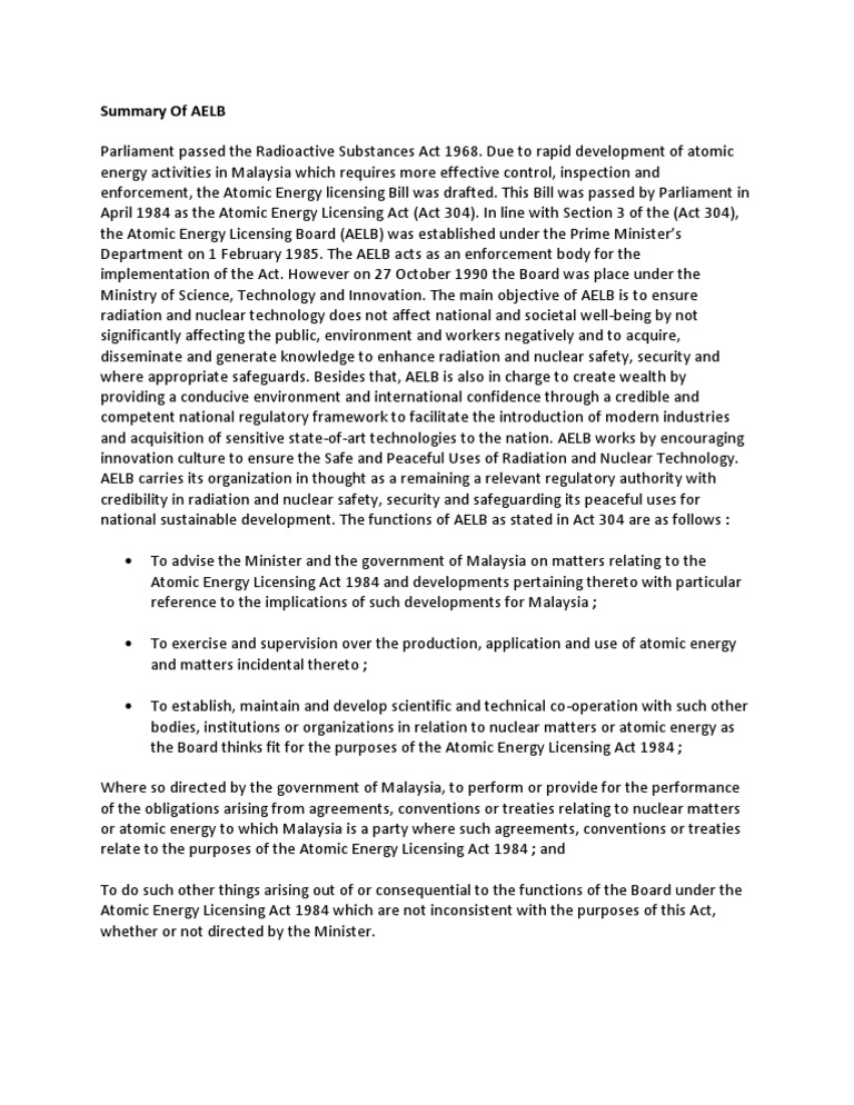 Laws Of Malaysia Act 304 Atomic Energy Licensing Act 1984 Nuclear Fuel Nuclear Power