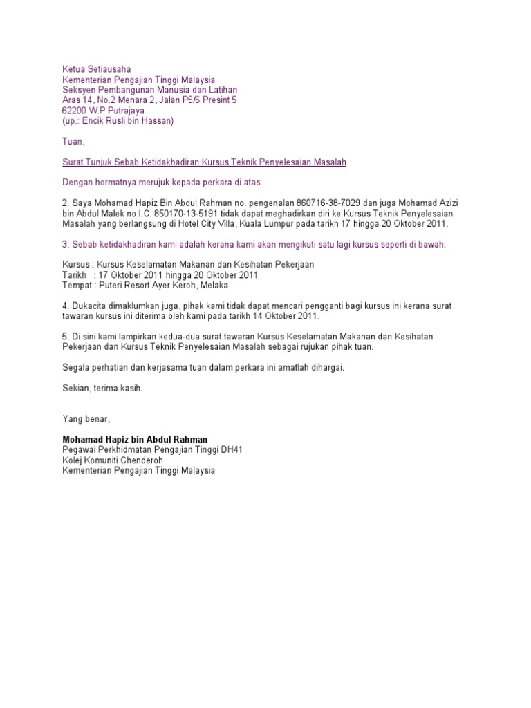 Bertugas surat tunjuk sebab tidak hadir bekerja. Ponteng tugas atau disebabkan faktor yang tak dapat dielakkan. Surat rasmi ini juga sangat berguna bagi pekerja atau individu yang bekerja di sektor swasta untuk memberitahu sebab mengapa tidak datang hadir bekerja atas sebab tertentu seperti hal hal kecemasan peribadi dll. Pengurus tuan puan surat tunjuk sebab ketidakhadiran kerja saya dengan segala hormatnya merujuk kepada perkara saya tidak dapat hadir kerja pada. Pastikan alasan kukuh dan tidak dibuat buat supaya majikan anda boleh terima.