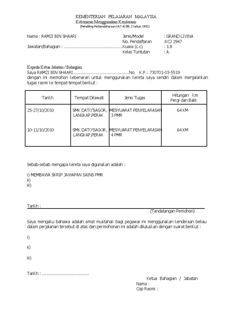 Borang Kelulusan Menggunakan Kenderaan Sendiri Pdf