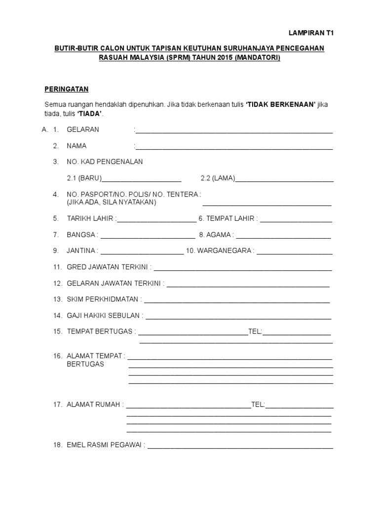 Lampiran T1 Butir Butir Calon Untuk Tapisan Keutuhan Suruhanjaya Pencegahan Rasuah Malaysia Sprm Tahun 2014 Mandatori Peringatan