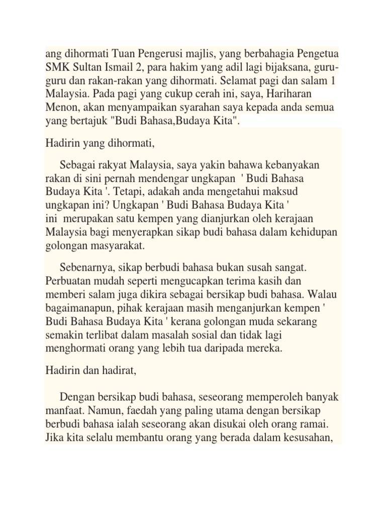 Pidato Berbudi Bahasa Budaya Kita Peringkat Zon Docx Pdf Document