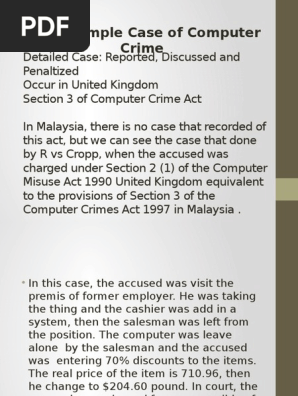L1cyberlaw Malaysia The Computer Crime Act 1997 The Computer Crime Act 1997 Enforced On 1 June 2000 Provides For Offences Against Cybercrime It Has 12 Course Hero