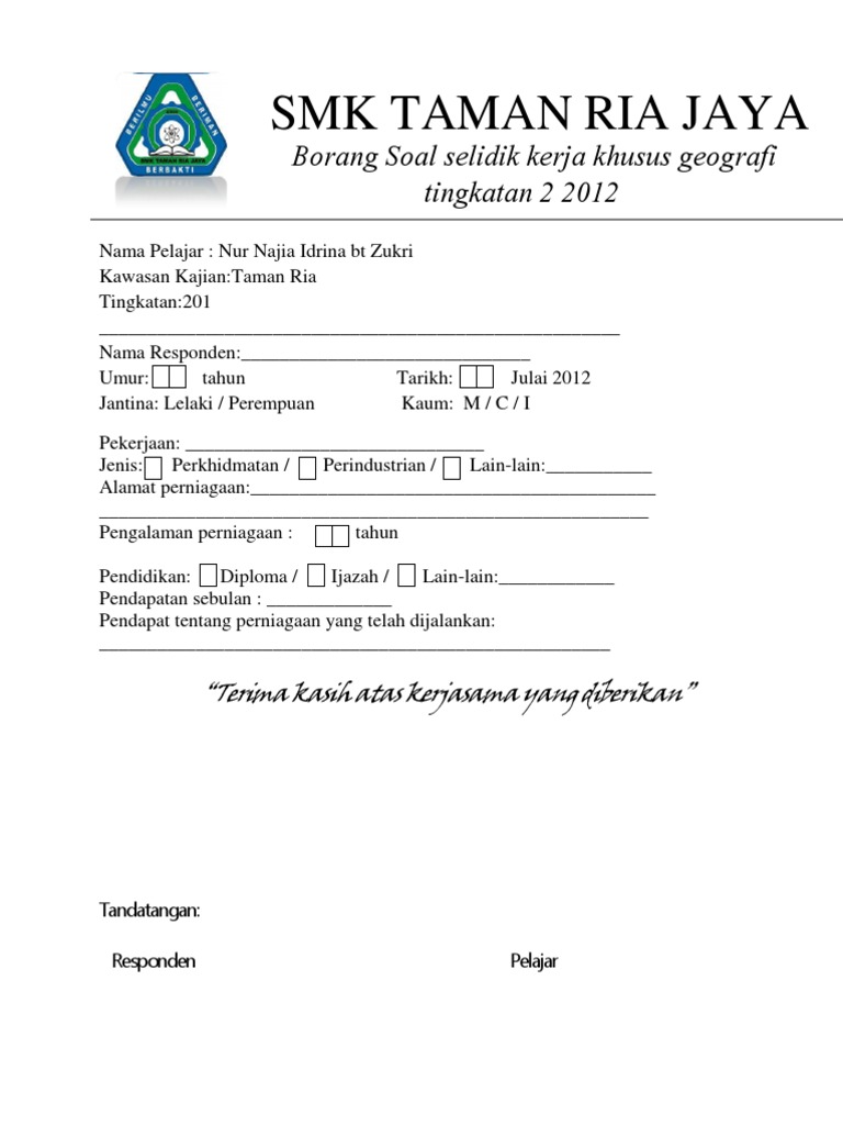 Borang Soal Selidik Temu Bual Kerja Lapangan Tugasan Geografi Tingkatan 3 Bumi Gemilang