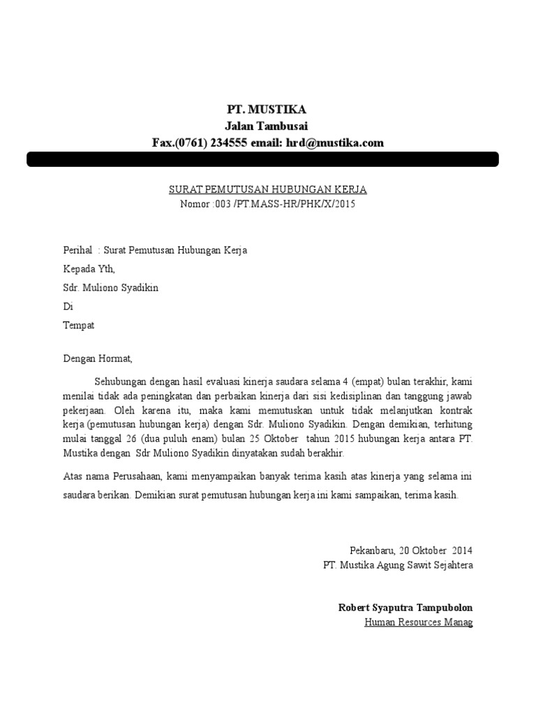 30 Contoh Surat Pemutusan Hubungan Kerja Phk Dengan Berbagai Alasan