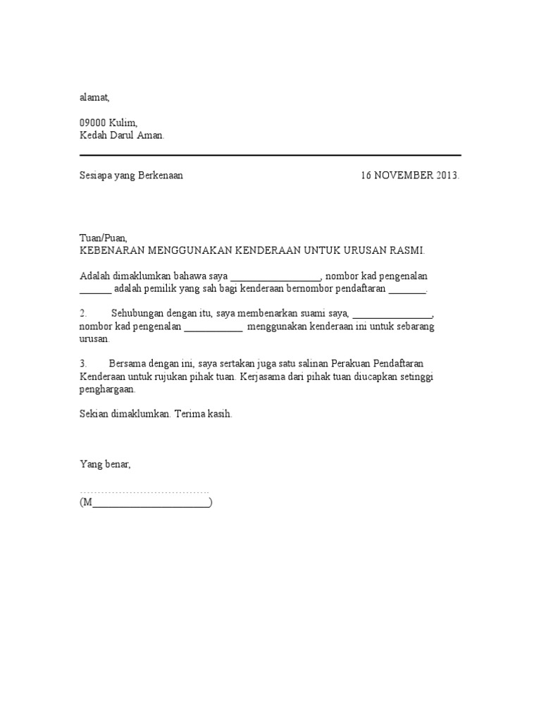 Contoh Surat Kebenaran Menggunakan Kenderaan Suami
