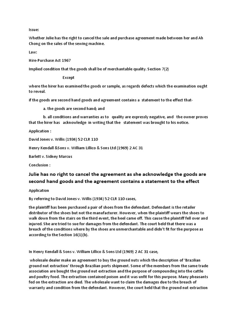 As To Implied Conditions In Hire Purchase Agreements There Are Three 3 Implied Course Hero